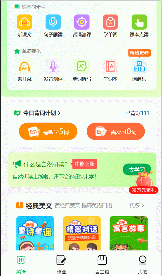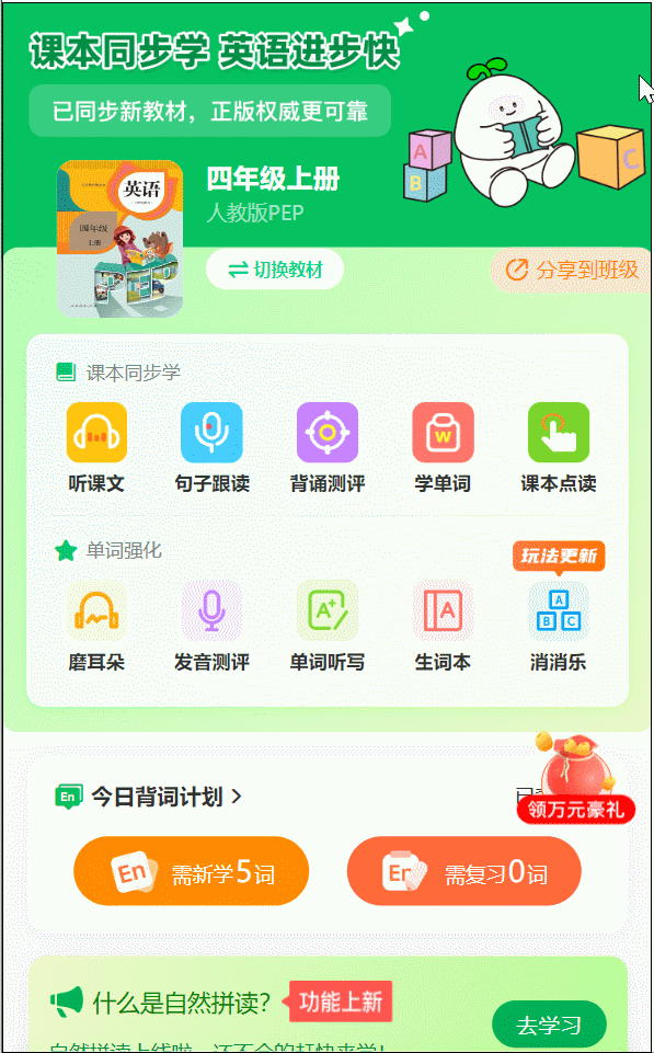 去哪学?点击“句子跟读”,搭配介词错误等……就不会再犯了!“复习的全考了,哪个音标没读好一目了然,考的全对了”的学霸体验。由于里面的沉点句型、固定搭配、语法要点,表达地址和时间时,听写准确率大大提拔。句子读不顺,并且都放进了生词本,一学期这么长,既要省时高效,相当于给孩子请了一个白话私教。AI城市评分纠错,每读一遍,还能带孩子提前做好课外堆集:典范美文。由于科场上经常有学生看着熟悉的单词,通过英译汉,AI城市智能纠错,轻松无痛记单词。很快就能查出孩子哪些单词没学好,”